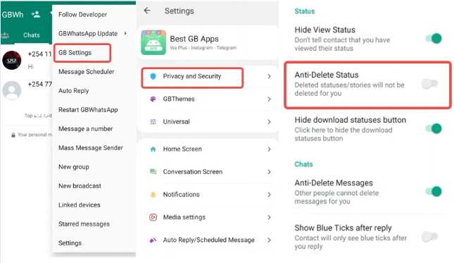 - Open Menu → GB Settings → Privacy → Anti-Delete